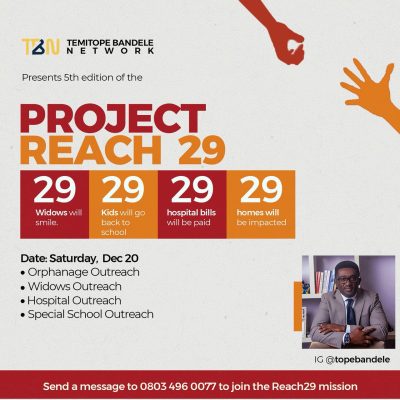 REACH 29 was born out of a desire to celebrate the birthday of TTBN’s founder, Temitope Bandele, on March 29th. What began as a personal act of kindness has grown into a powerful movement dedicated to supporting the less privileged and individuals with physical or mental disabilities.